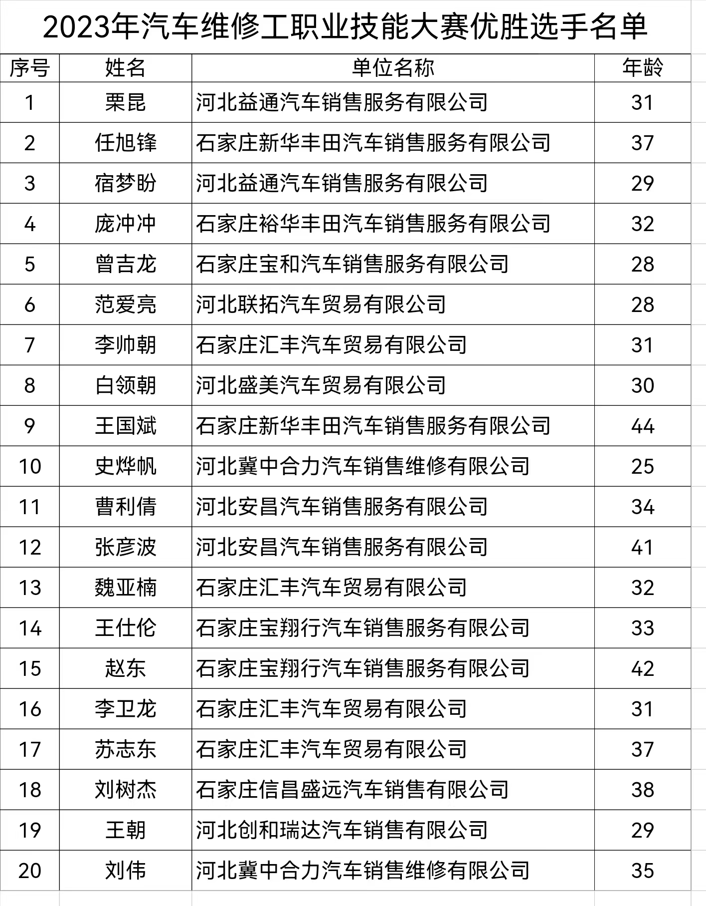 2023年汽車維修工職業(yè)技能大賽優(yōu)勝選手名單