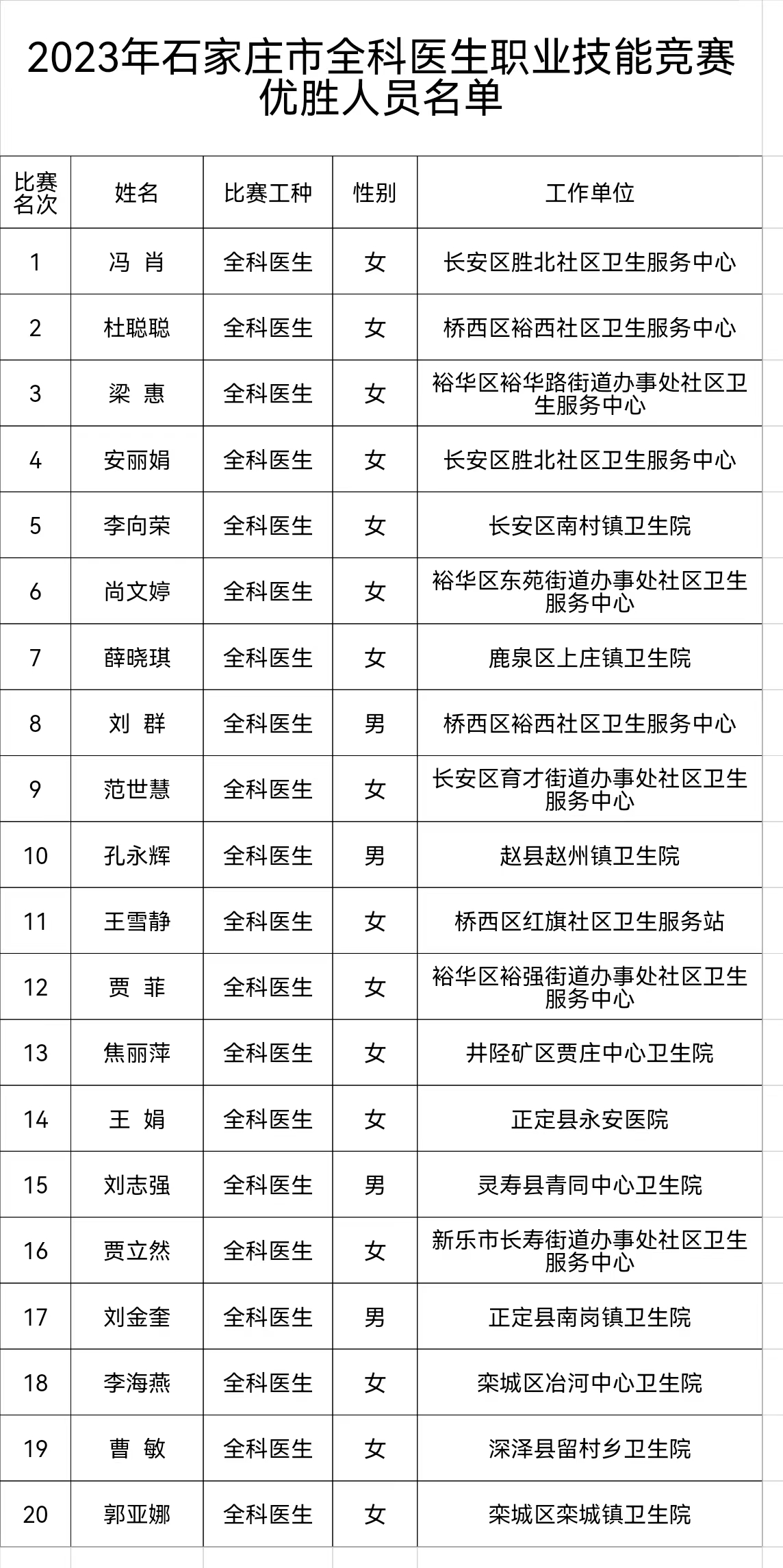 2023年石家莊市全科醫(yī)生職業(yè)技能競(jìng)賽優(yōu)勝人員名單