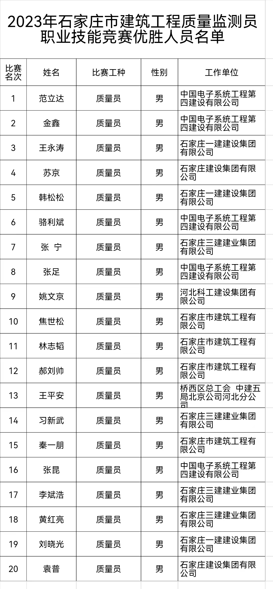 2023年石家莊市建筑工程質量監(jiān)測員職業(yè)技能競賽優(yōu)勝人員名單