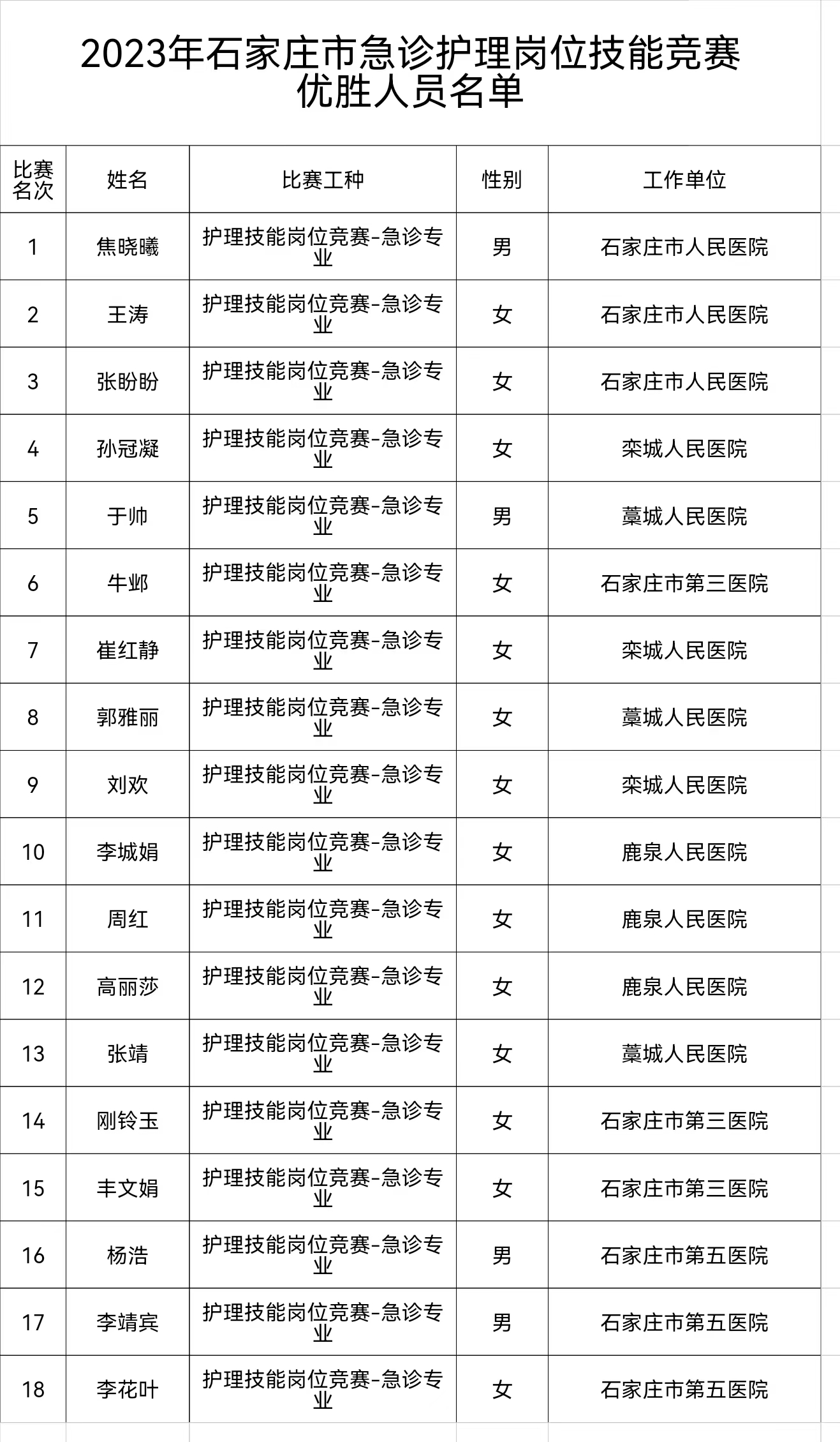 2023年石家莊市急診護理崗位技能競賽優(yōu)勝人員名單