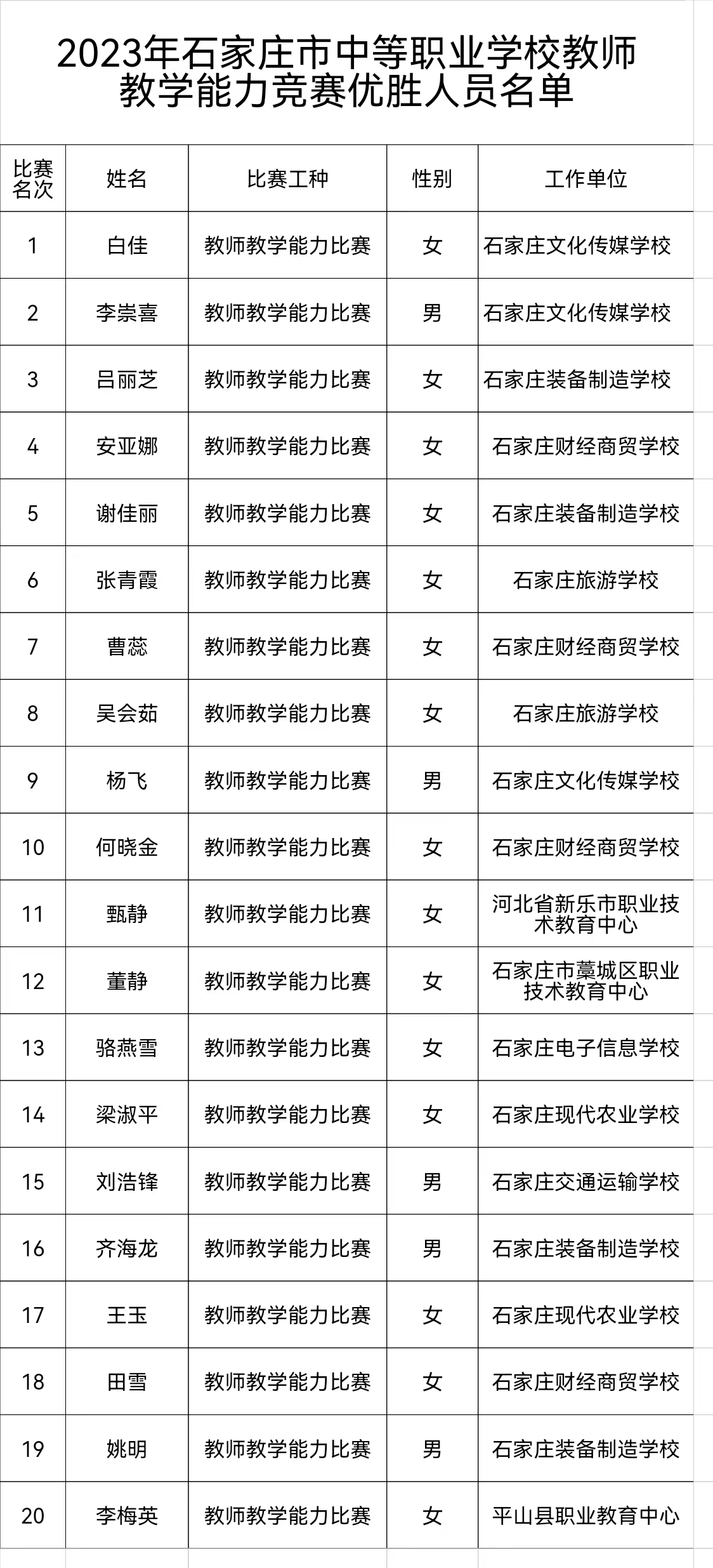 2023年石家莊市中等職業(yè)學(xué)校教師教學(xué)能力競(jìng)賽優(yōu)勝人員名單