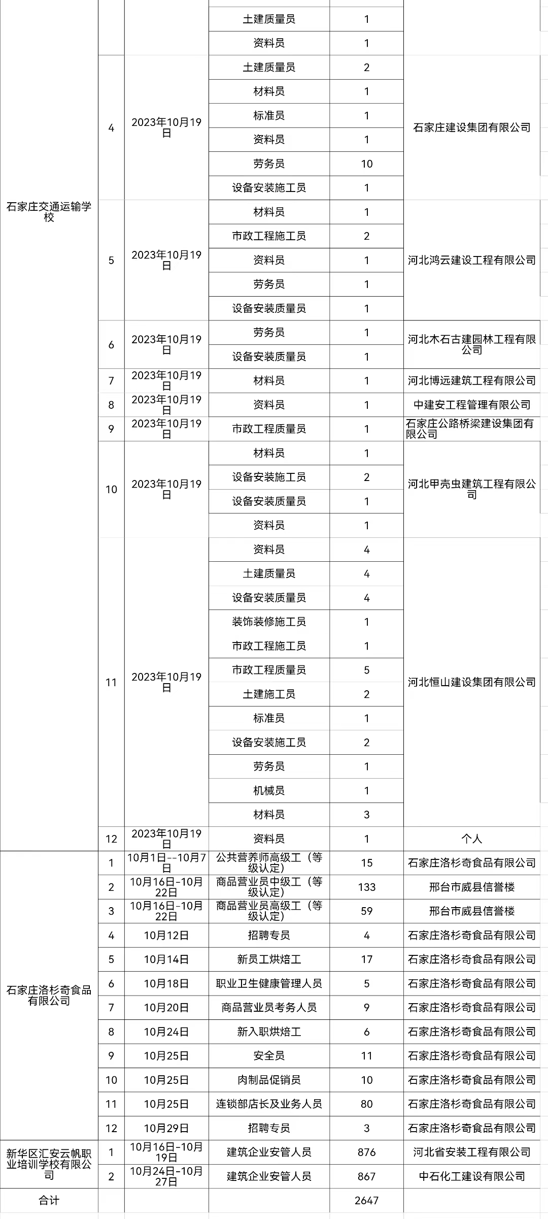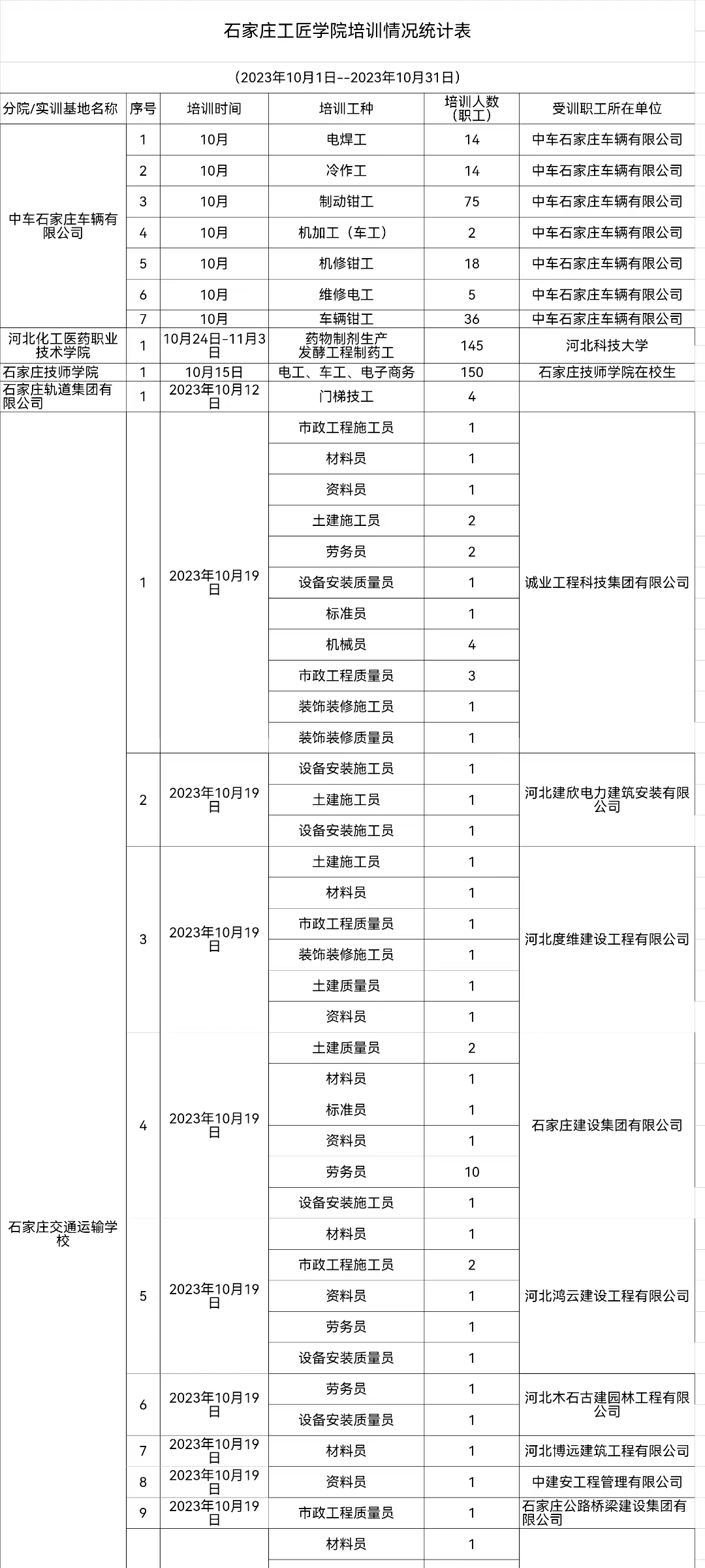 石家莊工匠學院10月份培訓情況統(tǒng)計表