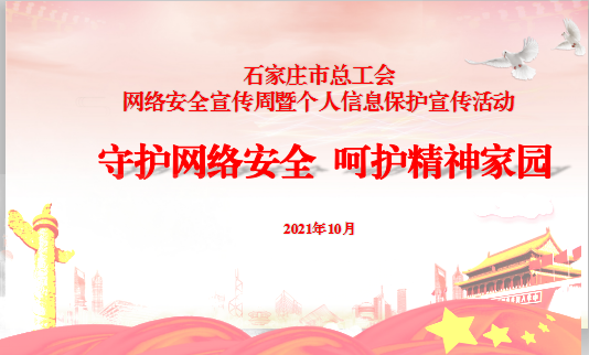 2021年10月12日上午石家莊市總工會(huì)開展網(wǎng)絡(luò)安全宣傳周暨個(gè)人信息保護(hù)宣傳活動(dòng)。